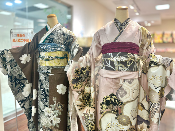 〈本きもの松葉〉へ親娘でご来店、振袖をご試着のお客様に